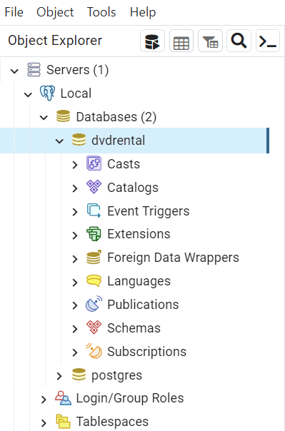 (15 rows)Load the DVD Rental database using the pgAdmin